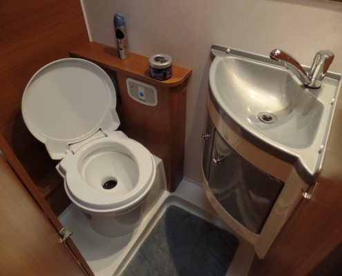 | Achter: | Keuken met toilet en wastafel |
