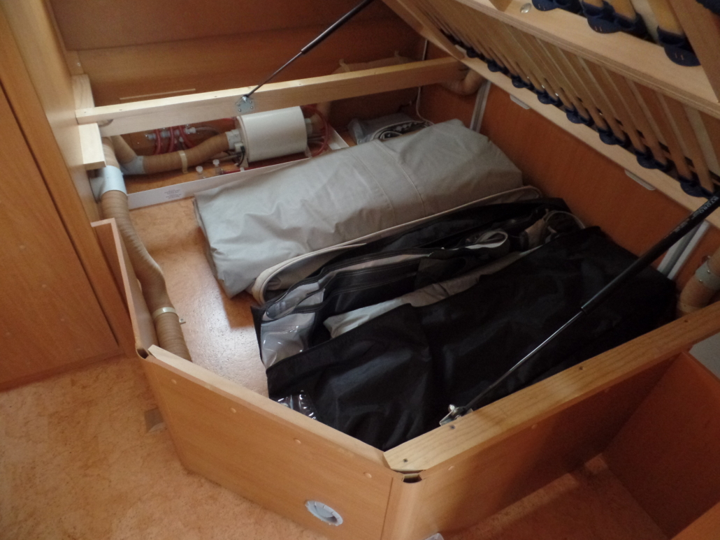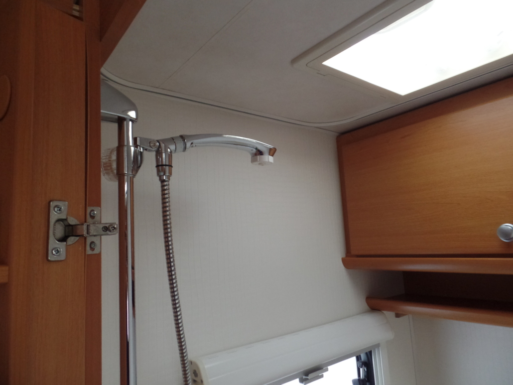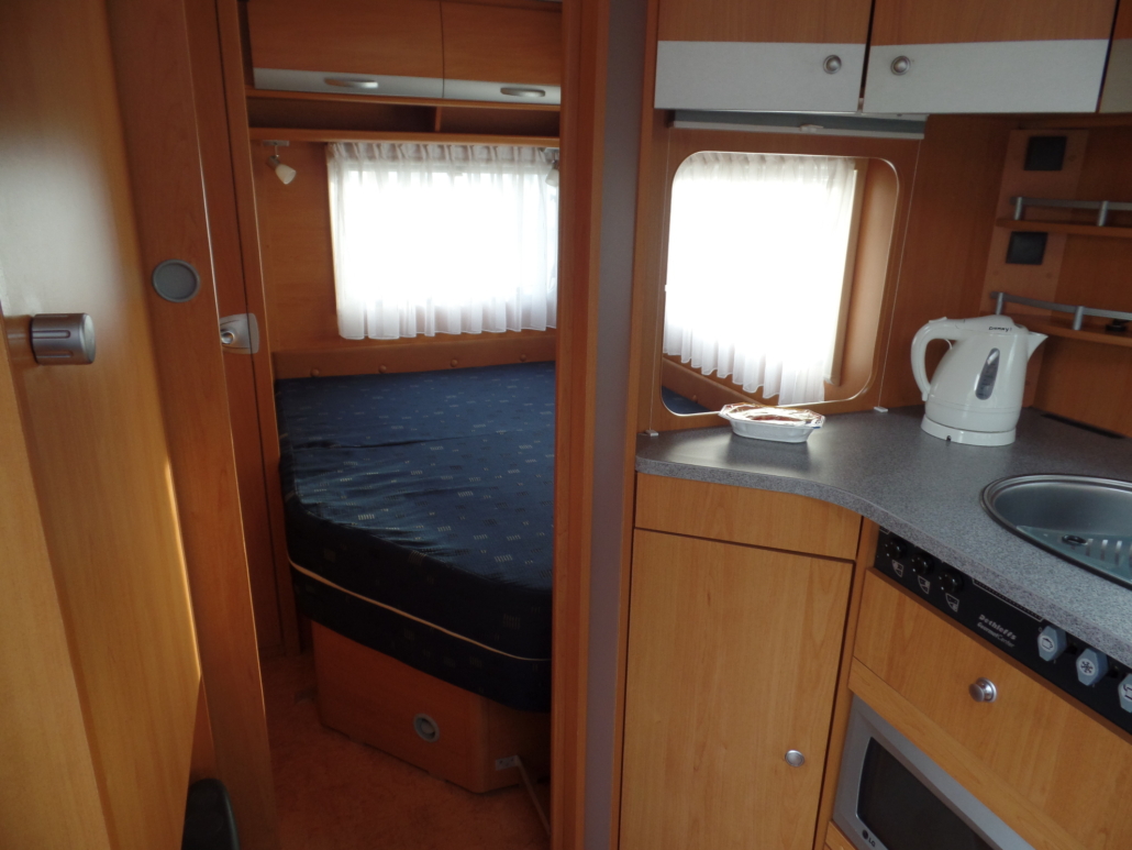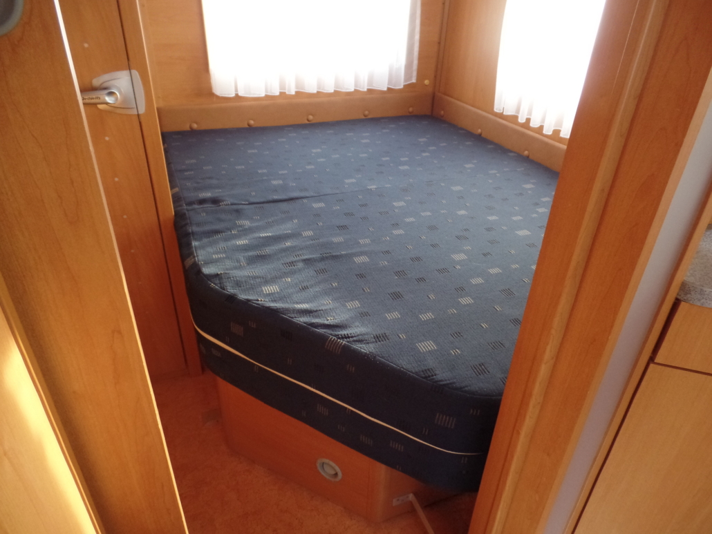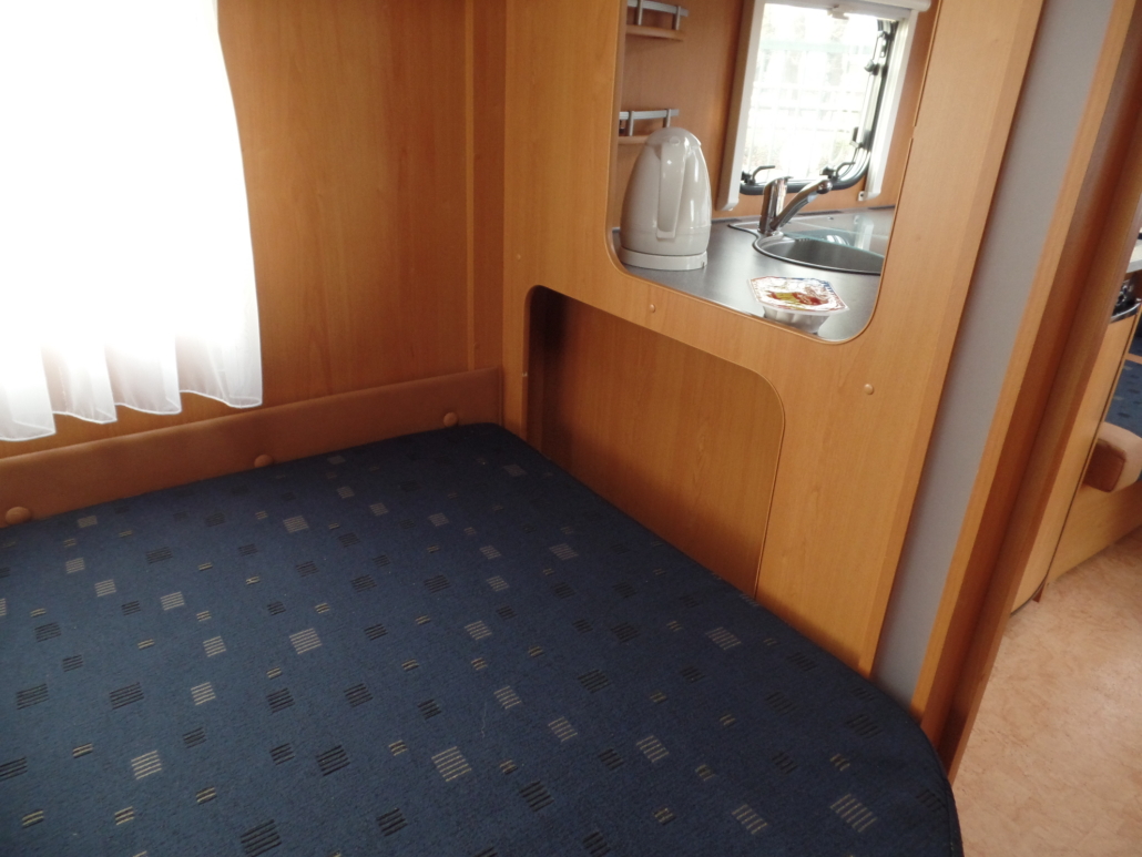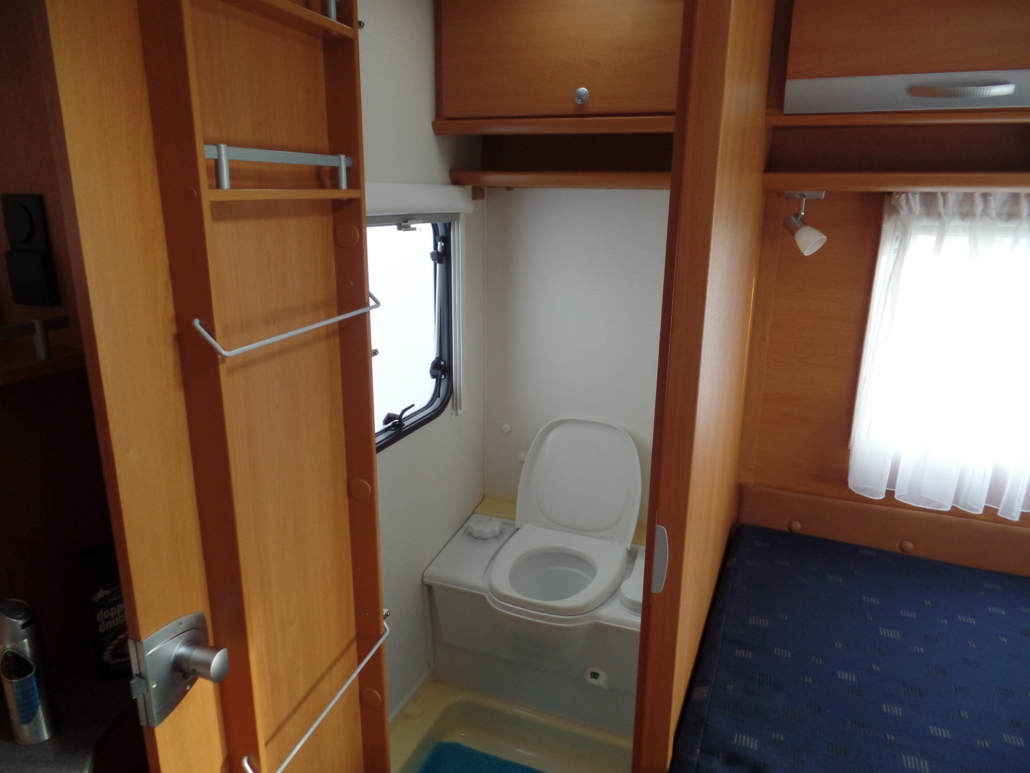 Achter:Vast bed in de lengte met toilet/douche en wastafel