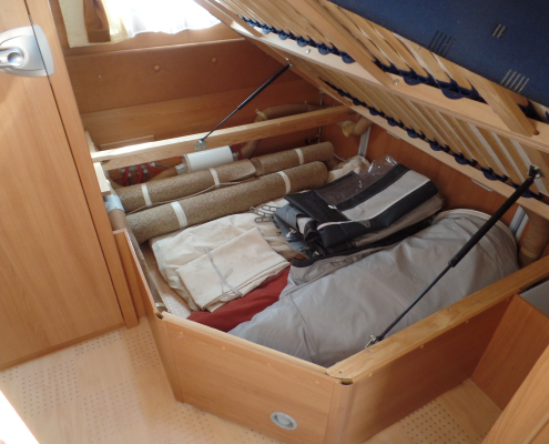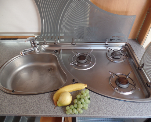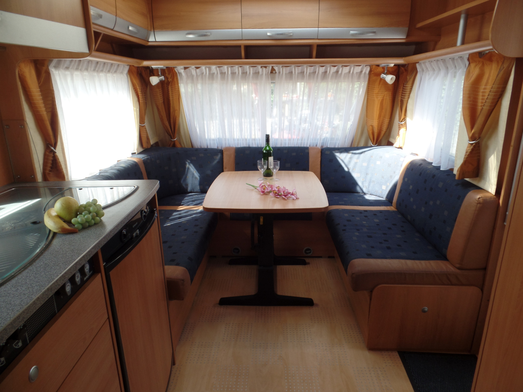 | Achter: | Vast bed in de lengte met toilet en wastafel |