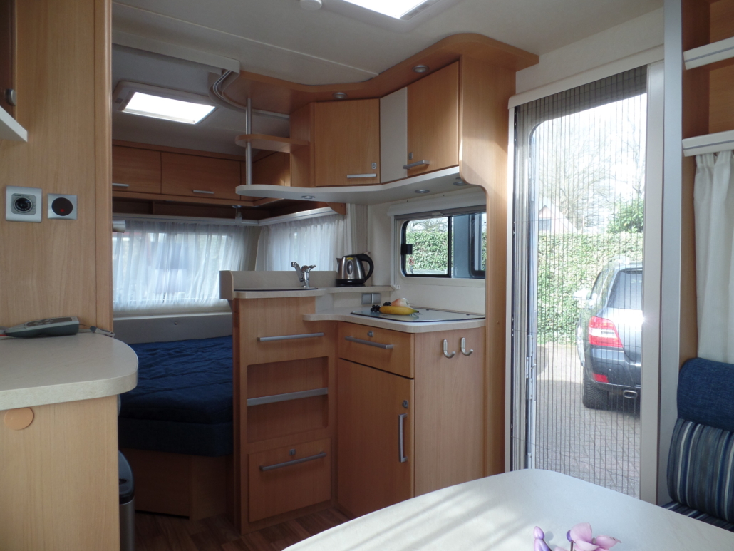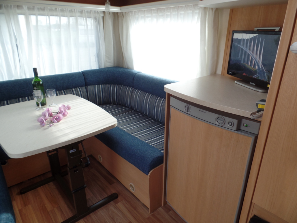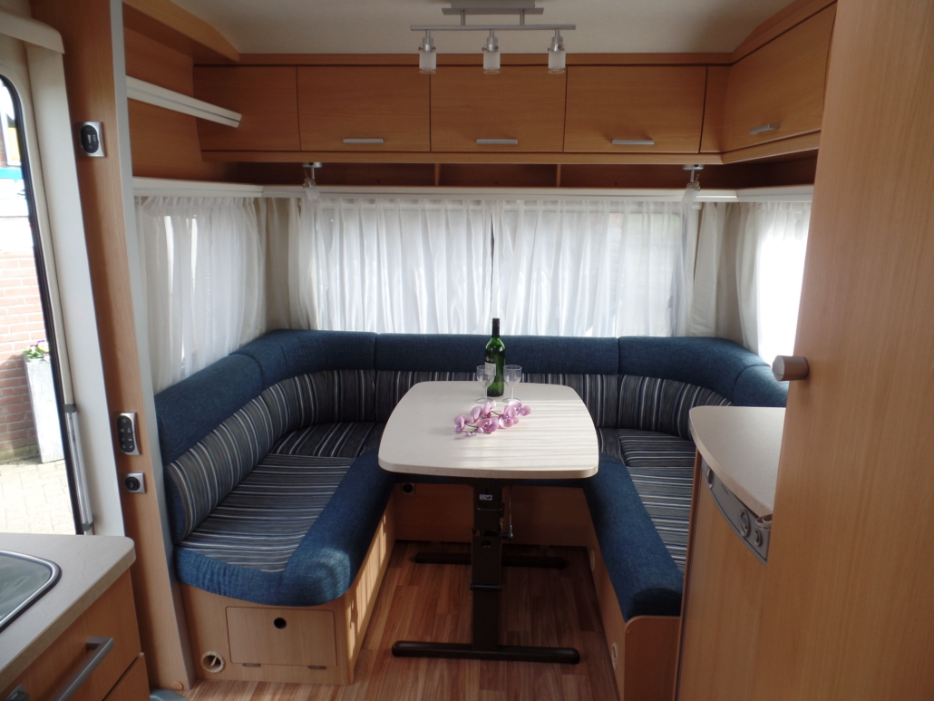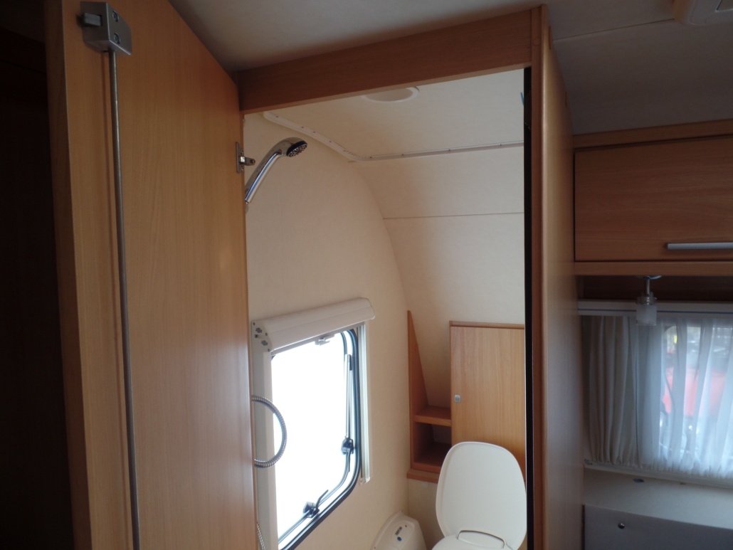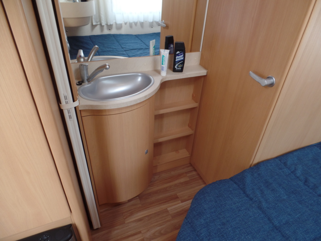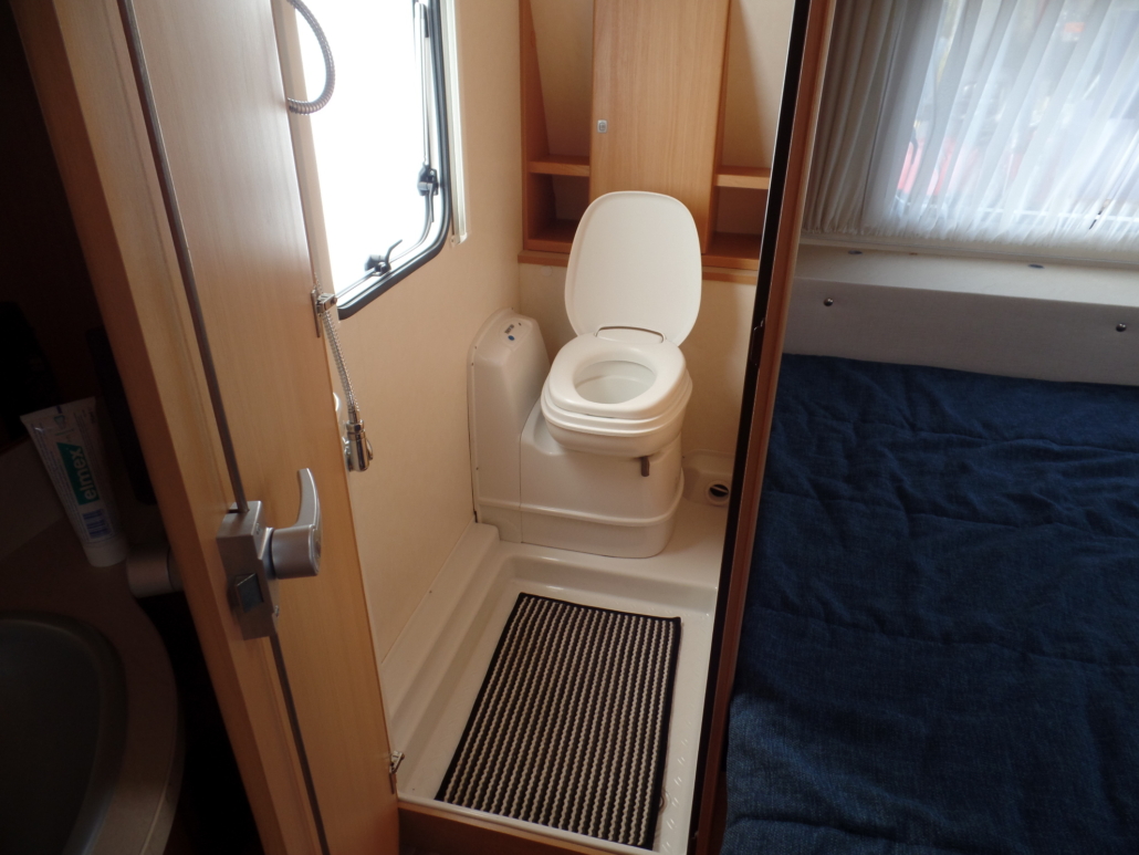 Voor:Vast bed in de lengte (frans bed) met toilet en wastafel